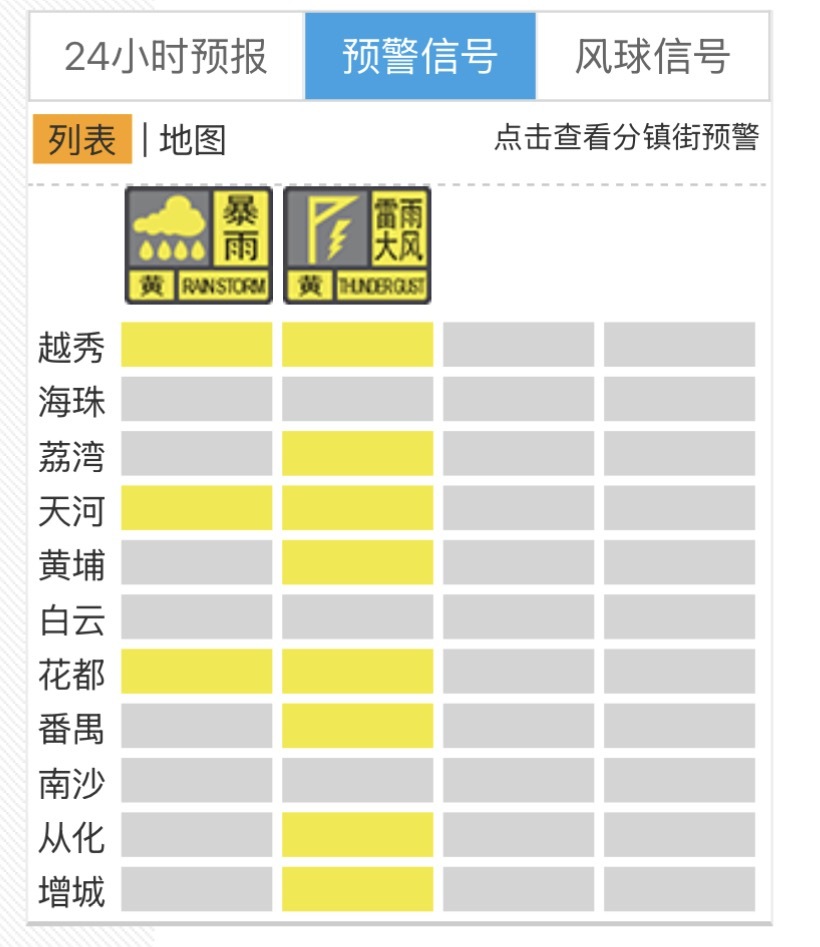 截至13∶30,越秀、天河、花都暴雨黄色预警生效;除海珠、白云、南沙外,其他区雷雨大风黄色预警生效。